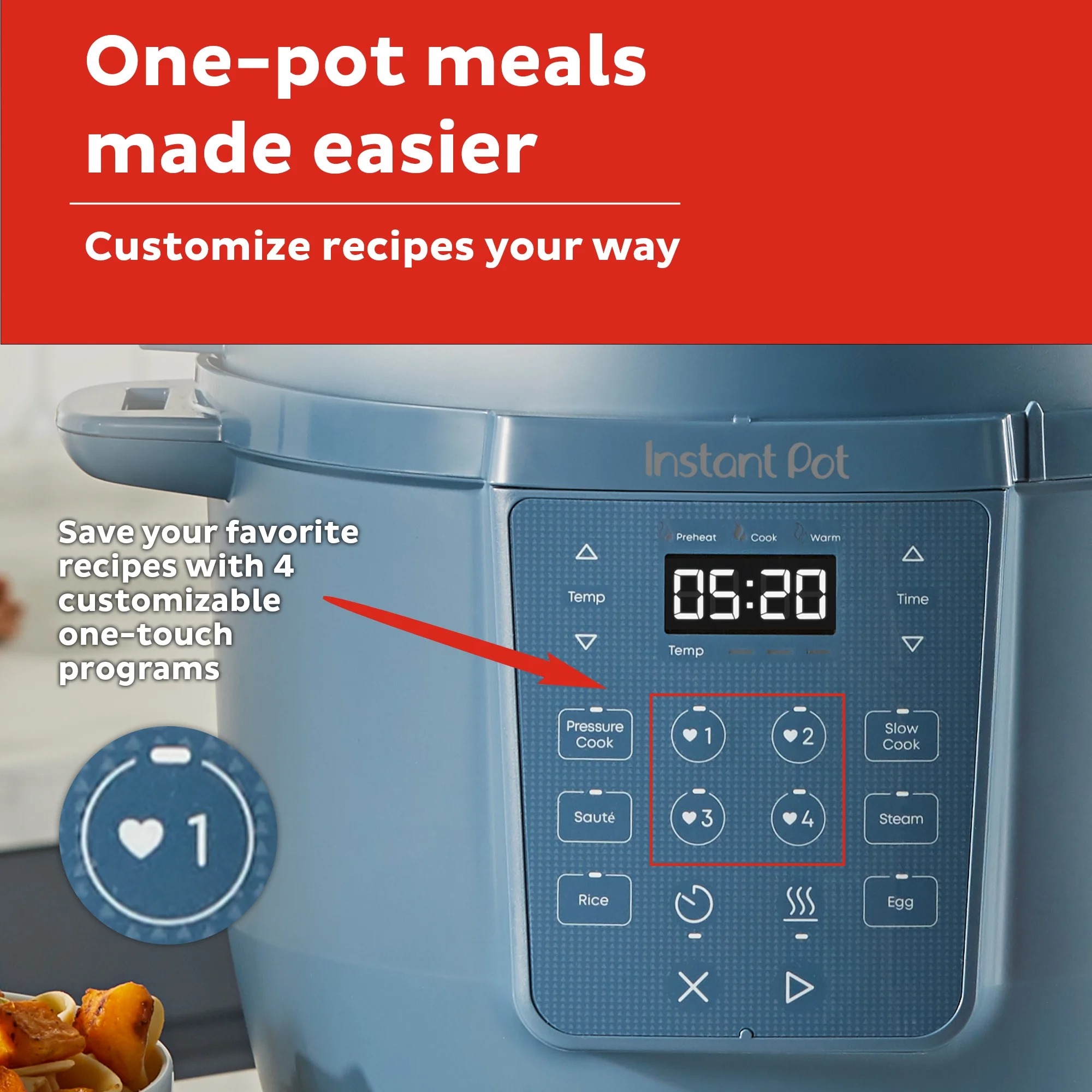• Your Favorites, Saved: 4 customizable presets let you store go-to recipe settings for even quicker cooking.